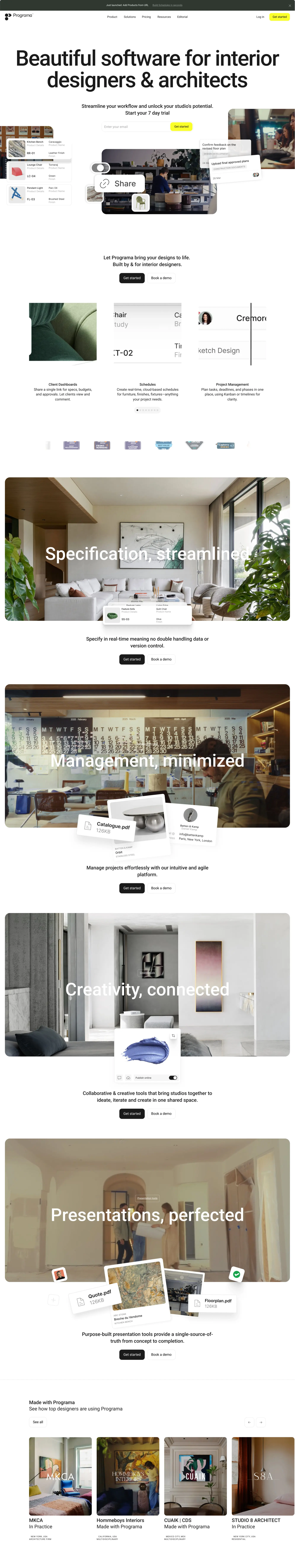Programa is a design-first software platform built for interior designers and architects, helping studios streamline workflow, manage products, and collaborate more efficiently. From sourcing and specifying to building schedules and managing procurement, Programa brings all aspects of design management into one intuitive space. Designed with the creative process in mind, it eliminates the mess of spreadsheets and emails, offering a smarter, more beautiful way to manage studio operations. With a focus on simplicity and elegance, Programa empowers design professionals to focus on what they do best—creating exceptional spaces—while saving time and unlocking their studio’s full potential. Start your free trial today.